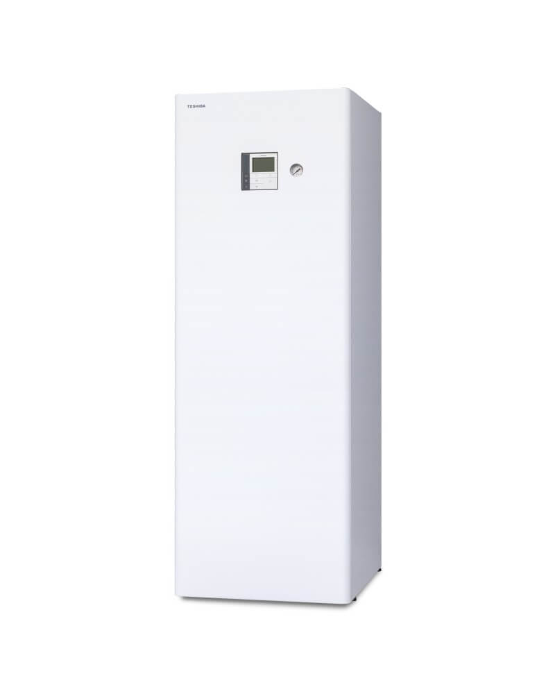 A TOSHIBA ESTIA R32 ALL IN ONE hőszivattyú innovatív és környezetbarát megoldás. A készülék egy belső egységből, úgynevezett hidroboxból, beépített 210 literes melegvíz-tartállyal és egy kültéri egységből áll.